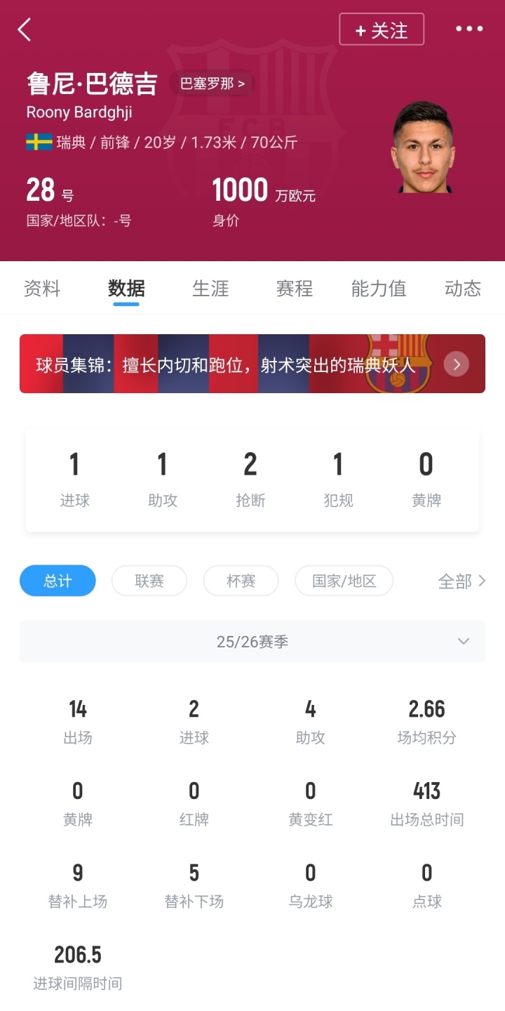 巴德吉现年20岁,去年夏窗巴萨花费250万欧从哥本哈根签下球员。本赛季巴德吉出场14次,出场时间413分钟,打进2球送出4次助攻。球员当前德转身价1000万欧。